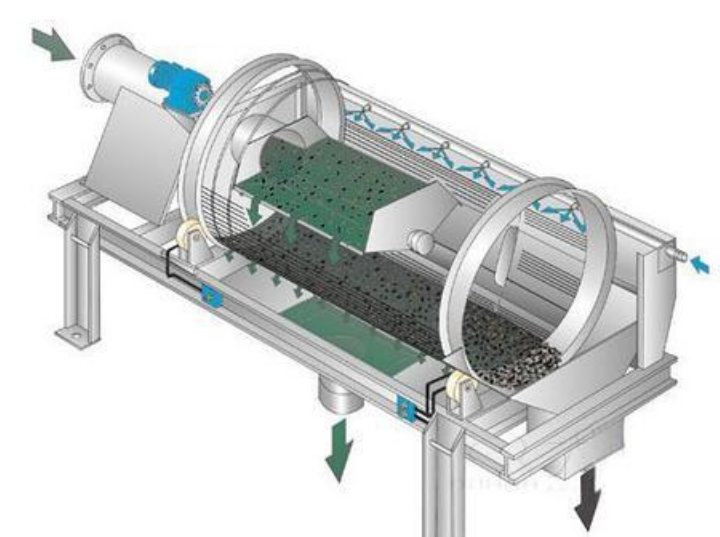 滾筒篩沙機(jī)主要有振動(dòng)電機(jī)、減速機(jī)、滾筒裝置、機(jī)架、密封蓋、進(jìn)出料口等部分組成,滾筒裝置傾斜安裝在機(jī)架上,電機(jī)經(jīng)減速機(jī)與滾筒裝置通過聯(lián)軸器連接在一起,驅(qū)動(dòng)滾筒裝置繞其軸線轉(zhuǎn)動(dòng)。